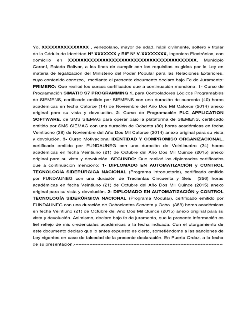 Formato De Declaracion Jurada Para Cursos Negocios Informatica Y Tecnologia De La Informacion
