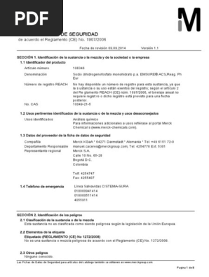 Anhidro El fosfato de sodio monobásico contiene una o dos moléculas de agua de hidratación, o es anhidro Contiene no menos del 98,0 por ciento y no más del 103,0 por ciento de NaH2PO4, calculado sobre una base anhidra Identificación Una solución (1 en ) responde a las pruebas de Sodio 191 y Fosfato. °C) 8,7 9,3 Metales pesados (en Pb) max 0,001 % Insolubles conforme ensayo Pérdida por desecación (1°C) máx 0,5 % Cloruro max 0,001 % Fluoruro max 0. HOJA DE DATOS DE SEGURIDAD CÓDIGO FRPGC16 EDICIÓN 2 FECHA Página 1 de 6 SULFATO DE SODIO ANHIDRO Nombre Comercial Sulfato de Sodio Anhidro Sinónimos Sulfato disodio, sal disodio, Sulfato sódico Uso Utilizado como desecante en el laboratorio o la industria química Se utiliza en la fabricación de.