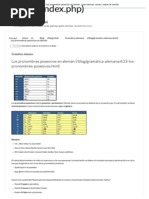 Con Lingolia Plus tendrás acceso a 9 ejercicios adicionales sobre Posesivos, así como 846 ejercicios online para mejorar tu alemán que podrás disfrutar durante tres meses por solo 10,49 euros (≈ $12,69). Gramática del alemán es la gramática del idioma alemán, centrándose en el alemán estándar El alemán es una lengua indoeuropea Al igual que la mayoría de lenguas de esta familia, es una lengua sintética que exhibe rasgos flexión en el nombre y el verbo Sintácticamente, el alemán es predominantemente de núcleo final es de tipo V2SOV aunque, como las mayoría de lenguas. Aprende cuáles son los pronombres posesivos en alemán Te lo explicamos con ejemplos y audios El pronombre posesivo se utiliza para hacer referencia al objeto que pertenece a una persona.