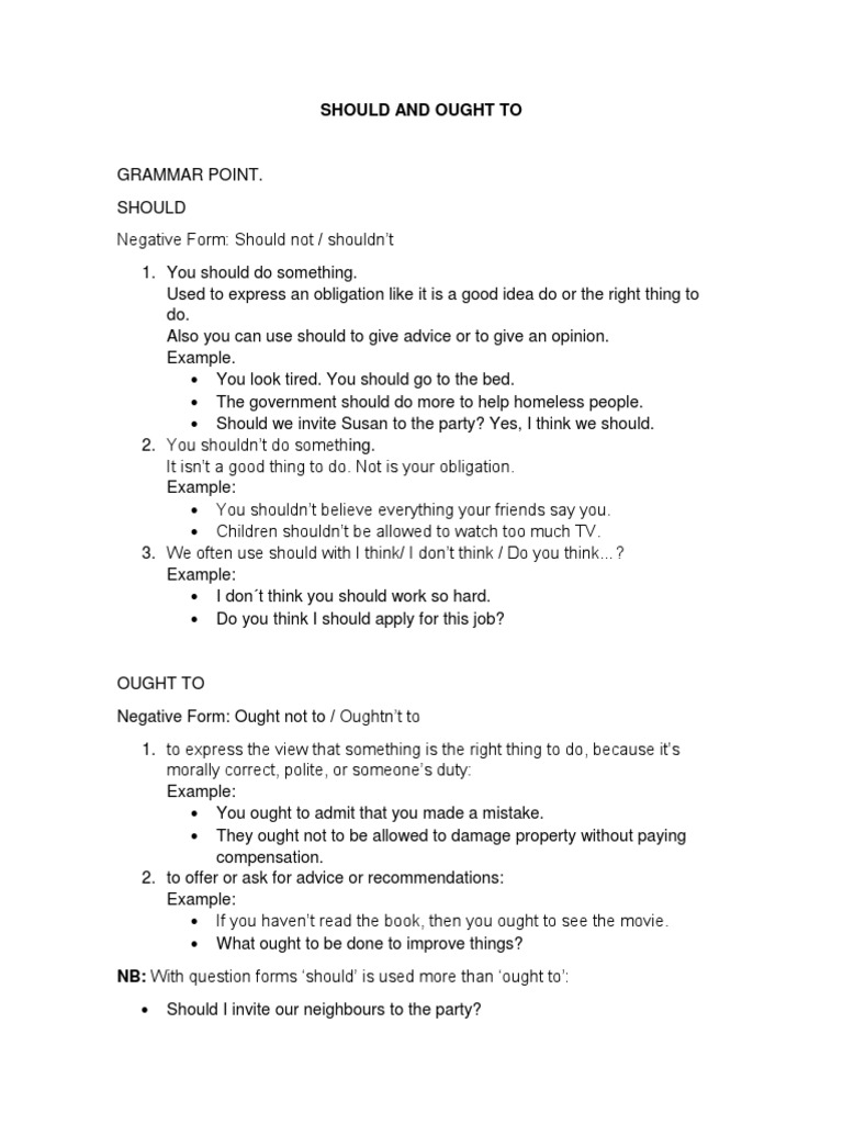 B You ought to report it to the police (= lt is a person's duty to report it) On the other hand, when we are giving a personal opinion, we. Ought to – should is used to give advice or opinion and one can choose to follow or ignore it, whereas ought to is used when the advice has to be followed While should and ought to are used interchangeably, ought to is a stronger word compared to should and is more appropriate to use while talking about rules, regulations and laws. Wwwenglishareacom Los mejores recursos gratuitos para aprender y enseñar in glés • Consejos should y ought to equivalen en español a debería infinitivo Ejemplos You should / ought to eat less fat They should / ought to be more careful about what they say You should / ought to come with me to the party It will be fun She shouldn´t / oughtn´t to be so rude.